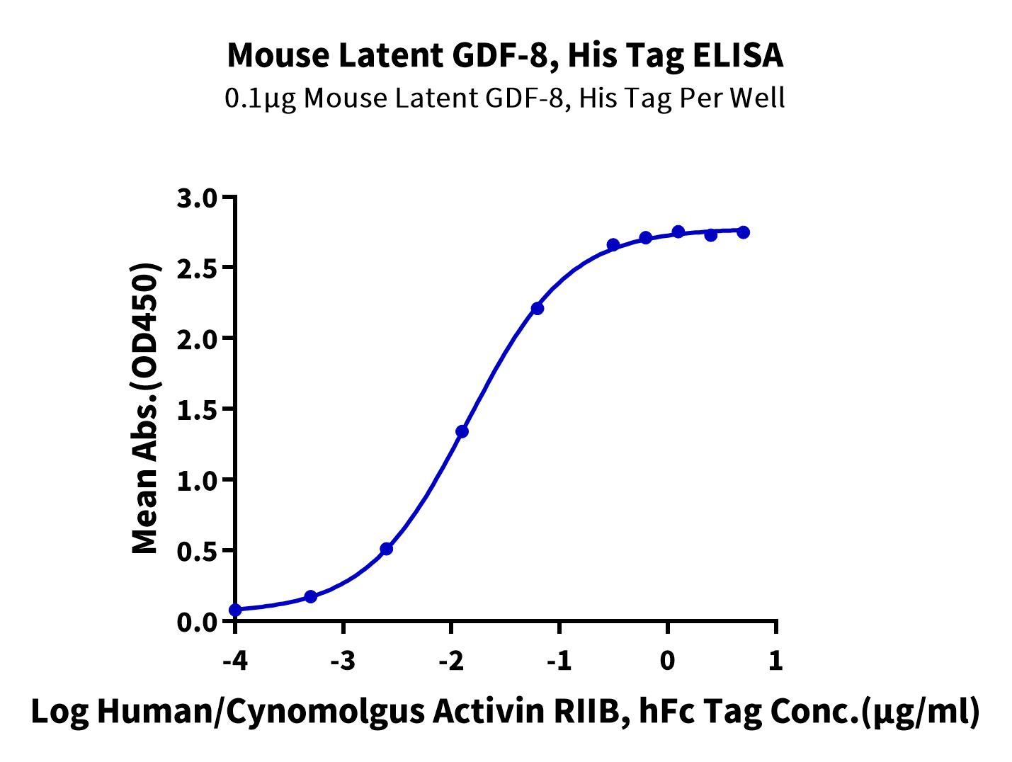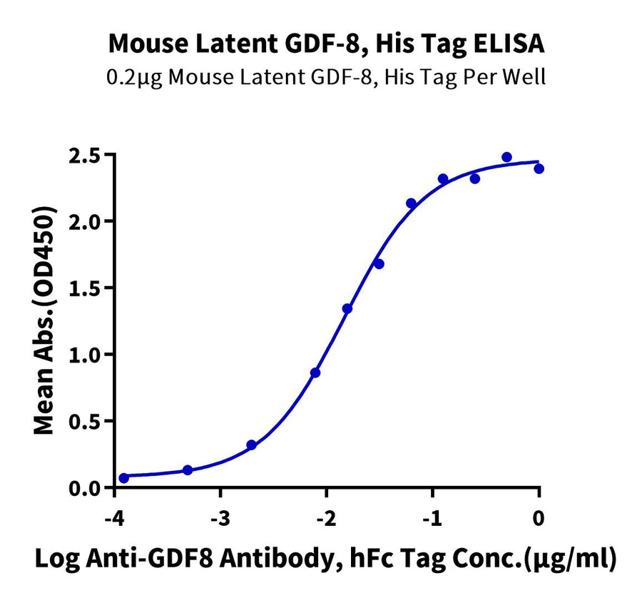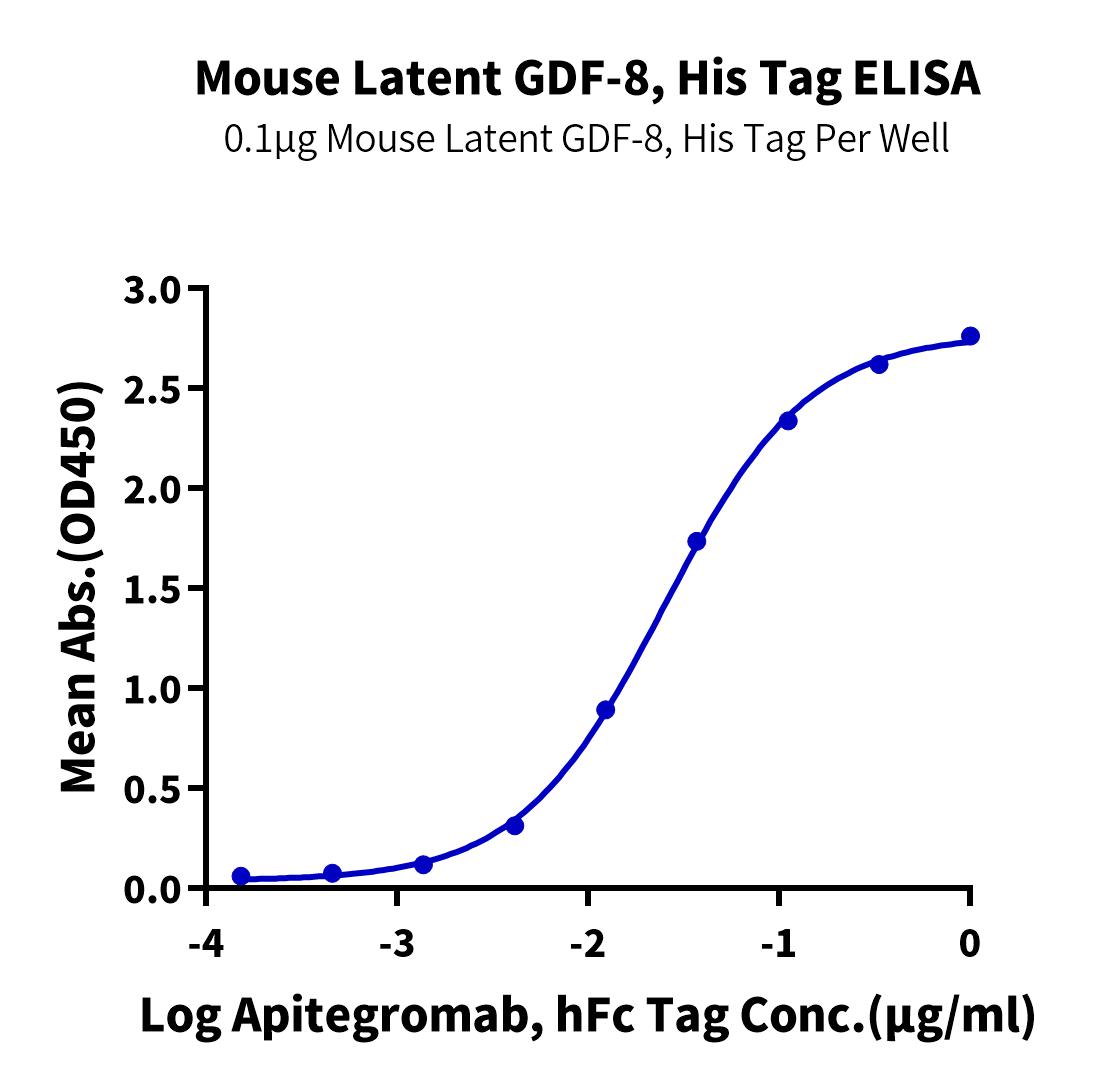 - Activity: Immobilized Mouse Latent GDF-8, His Tag at 1ug/ml (100ul/well) on the plate. Dose response curve for Apitegromab, hFc Tag with the EC50 of 24.7ng/ml determined by ELISA.