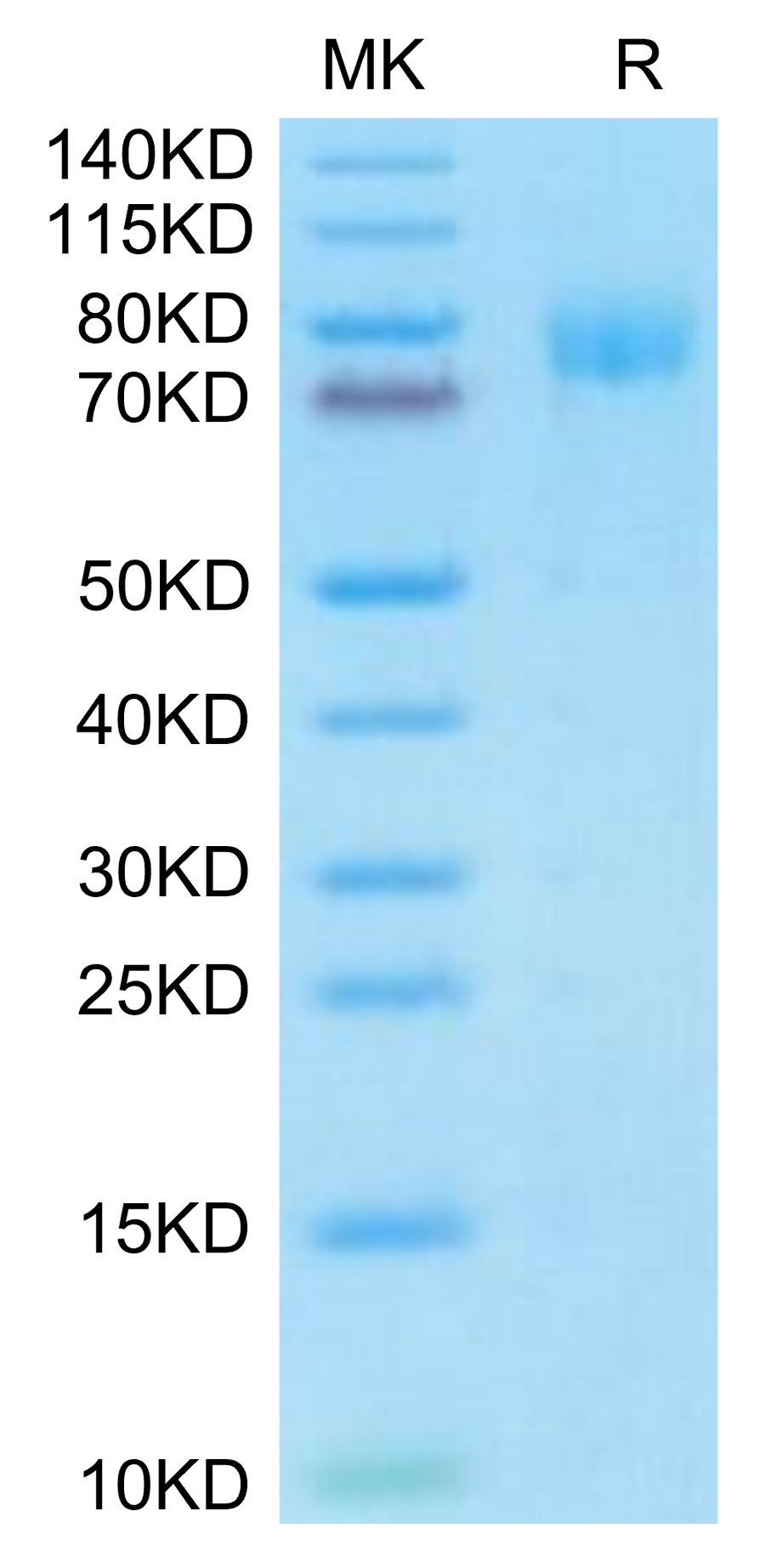 The protein has a predicted MW of 60.9 kDa. Due to glycosylation, the protein migrates to 75-95 kDa based on Bis-Tris PAGE result. |