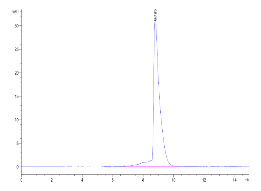 The protein has a predicted MW of 50.86 kDa. Due to glycosylation, the protein migrates to 60-70 kDa based on Bis-Tris PAGE result. |
