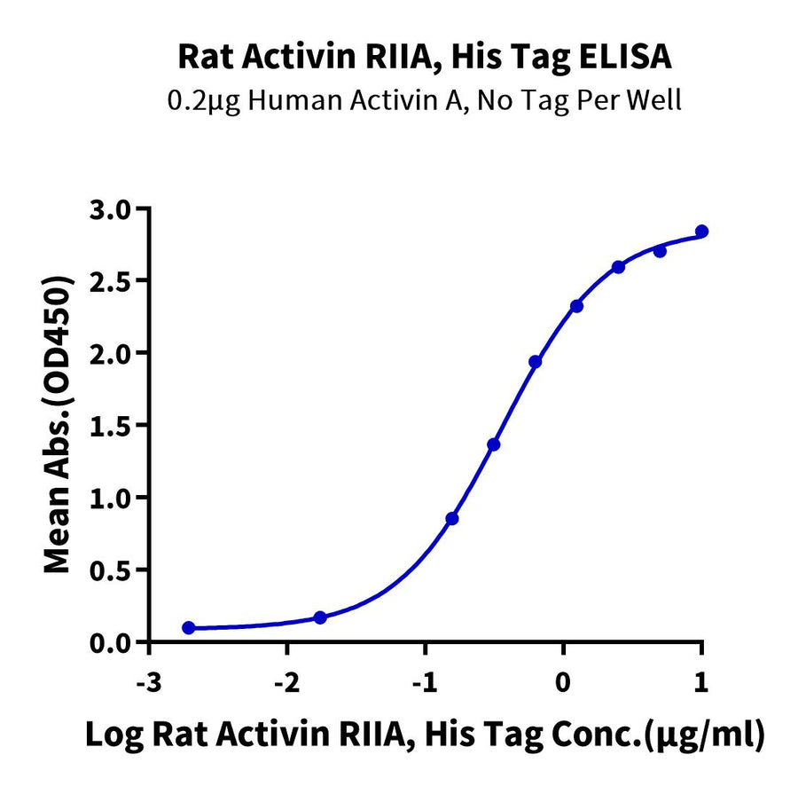 - Activity: Immobilized Human Activin A, No Tag at 2ug/ml (100ul/well) on the plate. Dose response curve for Rat Activin RIIA, His Tag with the EC50 of 0.36ung/ml determined by ELISA (QC Test).