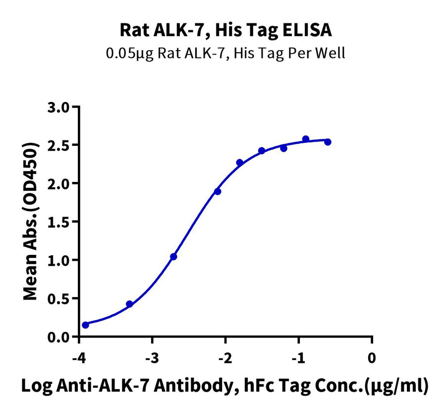 Immobilized Rat ALK-7, His Tag at 0.5ug/ml (100ul/well) on the plate. Dose response curve for Anti-ALK-7 Antibody, hFc Tag with the EC50 of 3.0ng/ml determined by ELISA. |