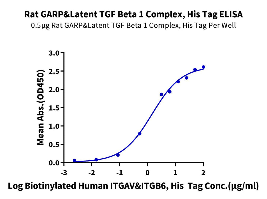 - Activity: Immobilized Rat GARP&Latent TGF Beta 1 Complex, His Tag at 5ug/ml (100ul/well) on the plate. Dose response curve for Biotinylated Human ITGAV&ITGB6, His Tag with the EC50 of 1.44ug/ml determined by ELISA.